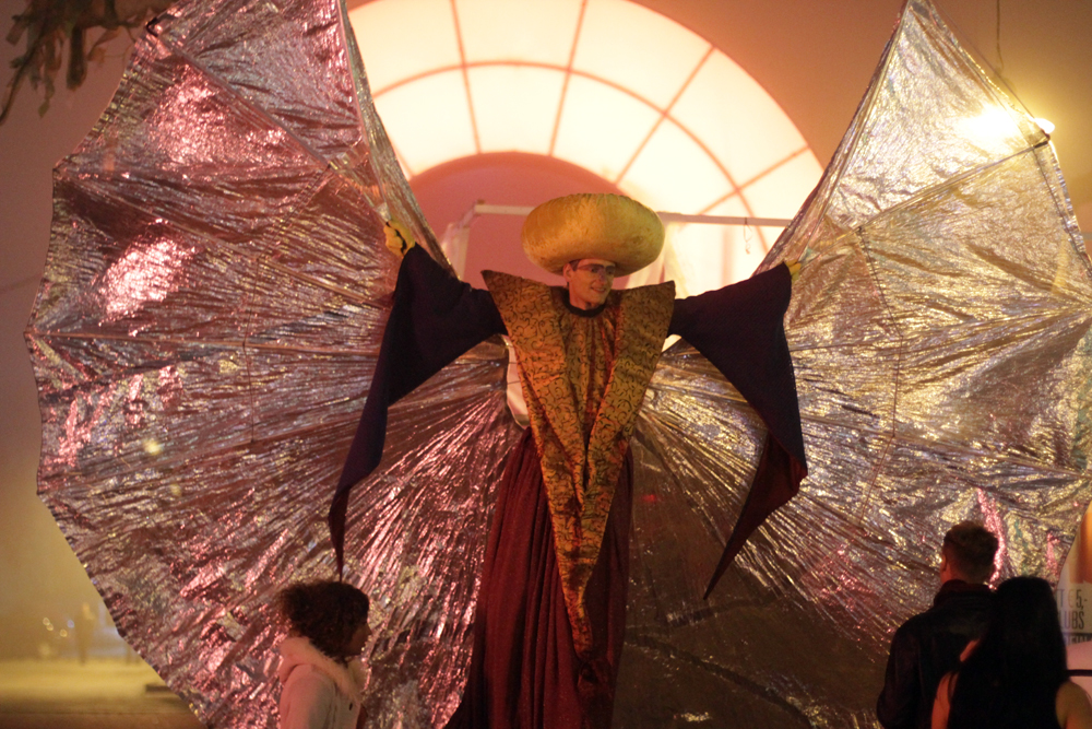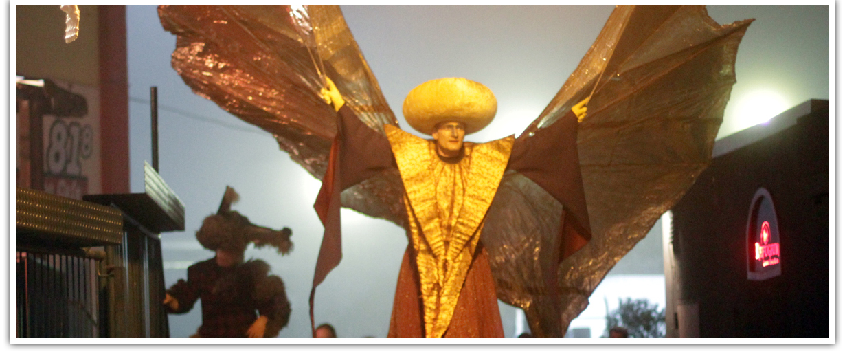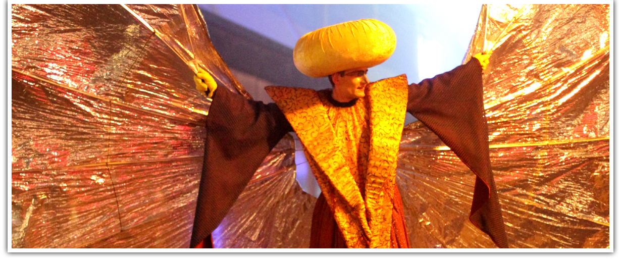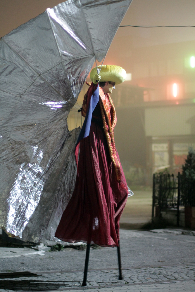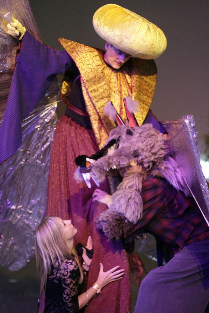 Ein unübersehbarer und verspielter Walkact auf Stelzen.